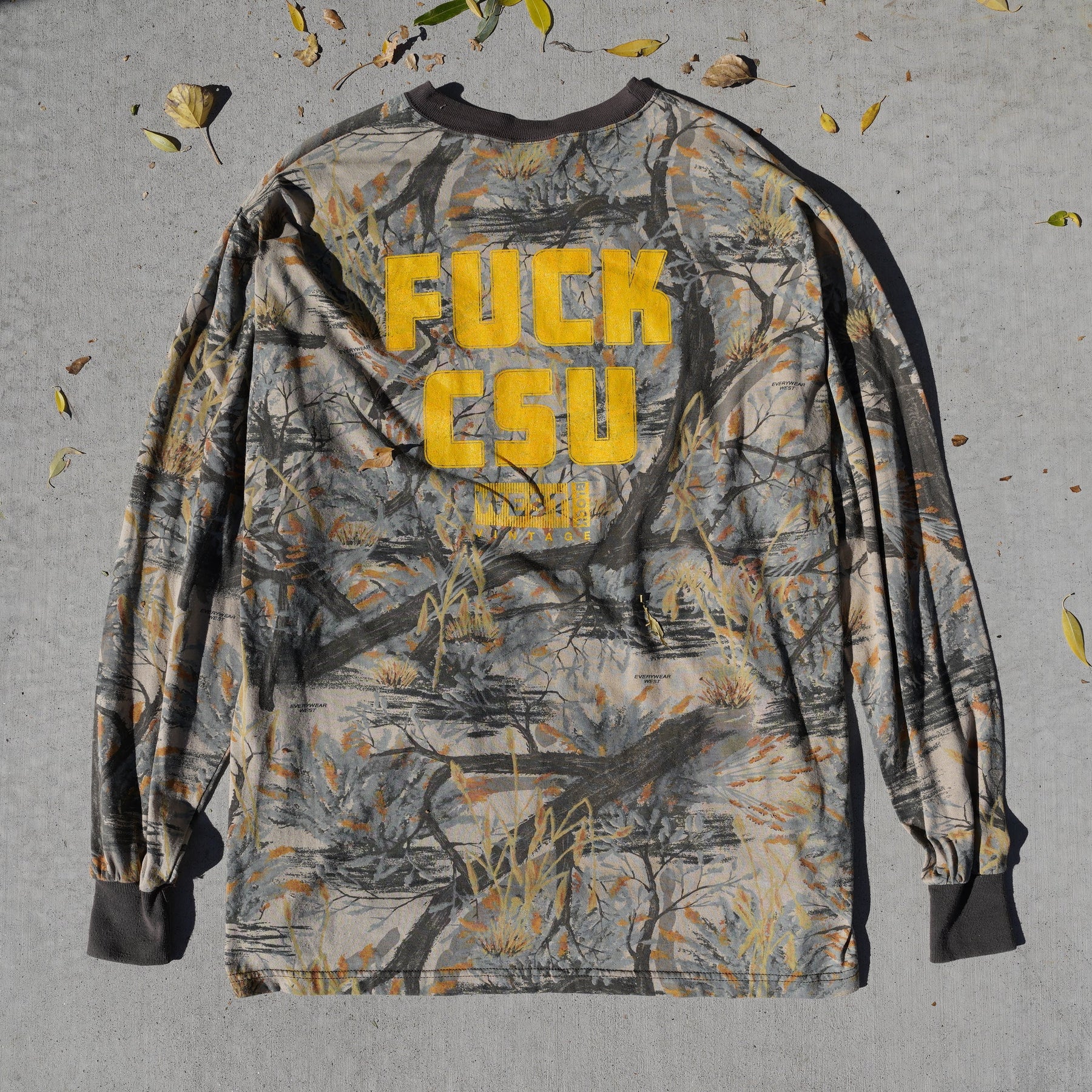 Reworked vintage tree limb camo long sleeve tee – 1990s style, screen printed in Wyoming, handcrafted outdoor apparel from the Vintage Wyoming Gear Collection at West Block Vintage.