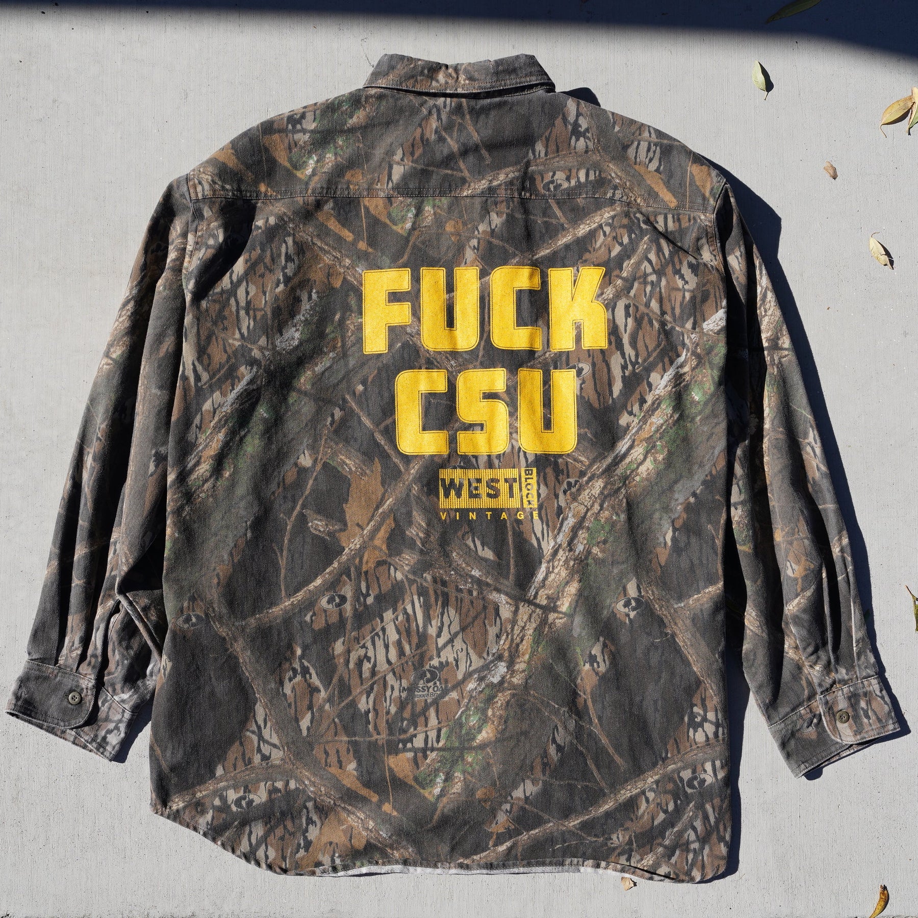 This Shadow Branch reworked vintage camo flannel captures Wyoming’s rugged outdoor aesthetic and 1990s fieldwear heritage. Made from heavyweight cotton with a deep branch camouflage pattern, it’s built for hunting, layering, and year-round outdoor wear.